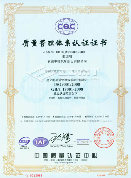 2010年4月,我公司順利通過了ISO 9001:2008版換證復審,獲得認證證書(證書編號:00110Q23628R2S/3400)。在此次復審過程中,中國質量認證中心(CQC)對我公司的質量體系運行情況進行了全方位嚴格審核,并對中德公司質量管理工作給予了充分的肯定。